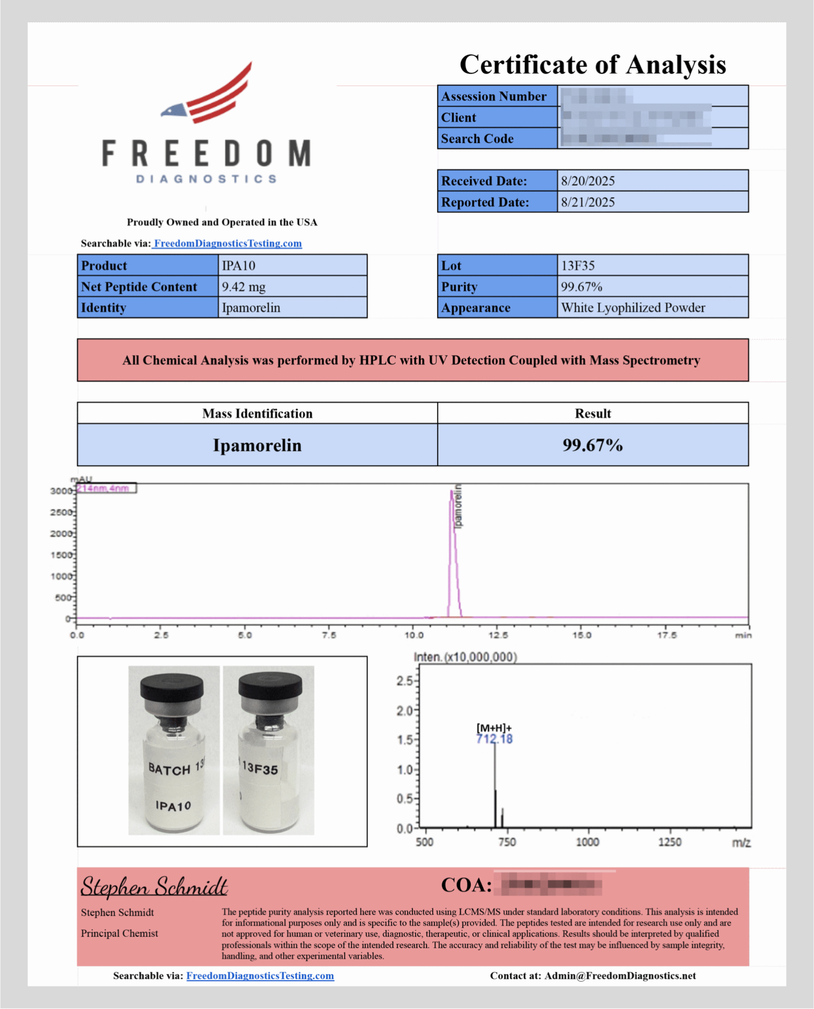 Please Note: Ipamorelin is supplied in a freeze-dried (lyophilized) form and must be reconstituted with bacteriostatic water to ensure proper mixing and stability.